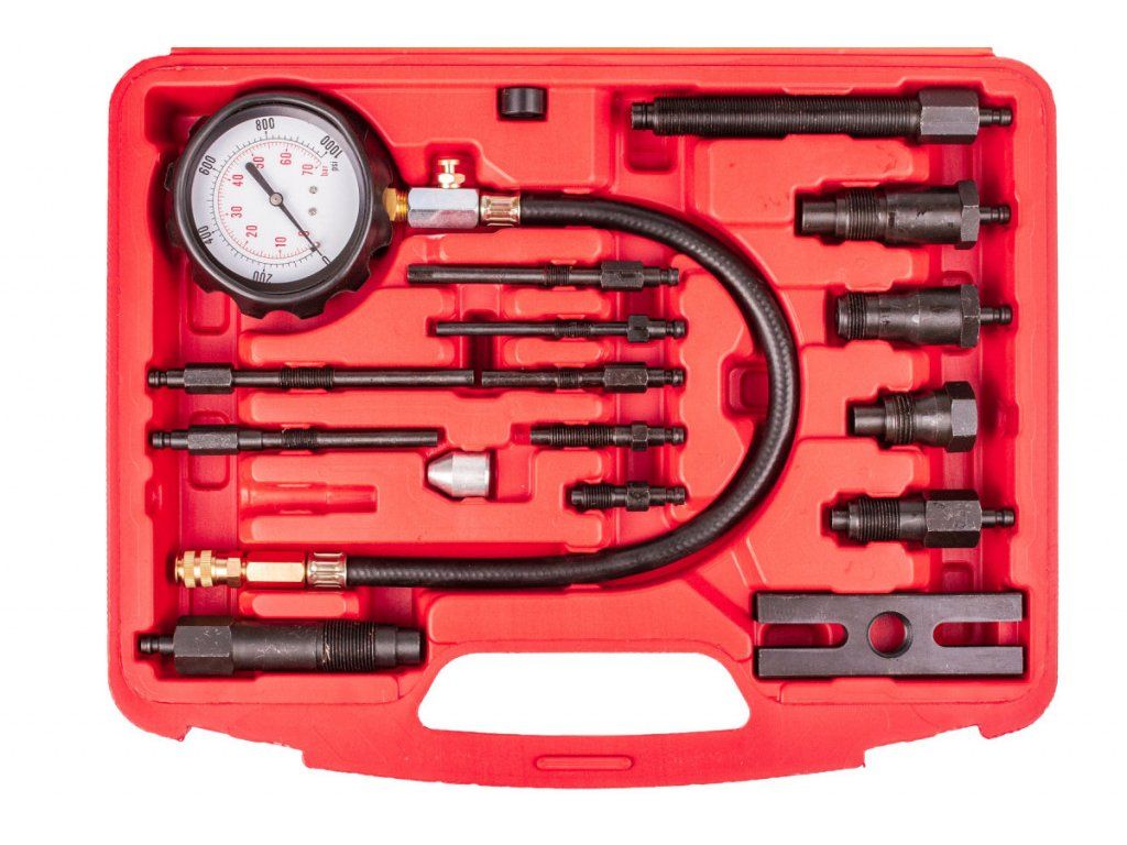 Sada pro měření komprese dieselových motorů s maximální hodnotou 70 bar. Sada obsahuje adaptéry pro připojení měřiče k většině vznětových motorů běžných značek automobilů. Souprava obsahuje manometr s maximálním rozsahem do 70 barů, prodlužovací adaptér, 10 adaptérů pro připojení přes žhavící svíčky motoru,4 adaptéry pro připojení k motoru přes vstřiky a montážní přípravek tvaru H. Vyrobeno z oceli C45. Souprava je uložena v plastovém kufru s prolisy pro snadný přenos a přehledné uložení součástí sady.