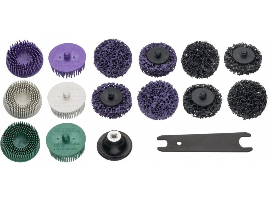 Sada obsahuje vysoce profesionální kartáčovou brusku uloženou v plastovém kufru společně s několika kotouči. Kotouče se přichycují k unašeči rychloupínacím systémem Roloc™, který umožňuje rychlou a snadnou výměnu plastového kartáče bez dodatečného nářadí.