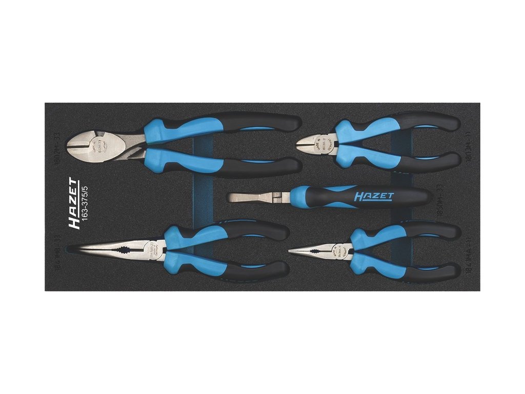 Sada kleští, kvalitní německý výrobce HAZET, pěnová vložka, vhodná pro dílenské vozíky HAZET, obsahuje 5 kusů kleští - ploché, štípací a kombinované.
