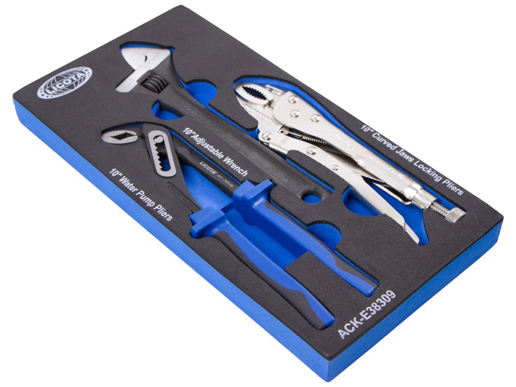 Sada nářadí v pěnové výplni skříněk a vozíků, značka LICOTA, obsahuje nastavitelný klíč, SIKO kleště a samosvorné kleště.