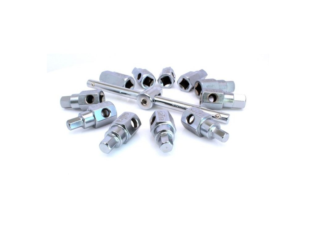 Nástrčné klíče pro olejové zátky 3/8", sada 12 ks, velikosti hlavic 8 - 17 mm, speciální šestihrany 5/16", 8/3", 11 mm, 13 mm. Posuvný T-klíč, chromovaný povrch.