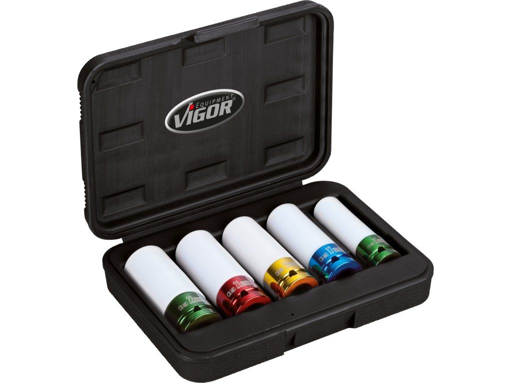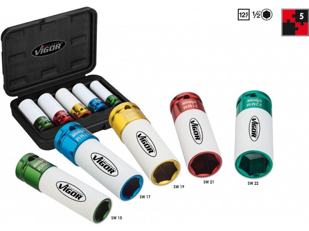 Sada obsahuje 5 ks klíčů o velikostech 15 mm (zelná), 17 mm (modrá), 19 mm (žlutá), 21 mm (červená) a 22 mm (modrozelená) a délce 80 mm.