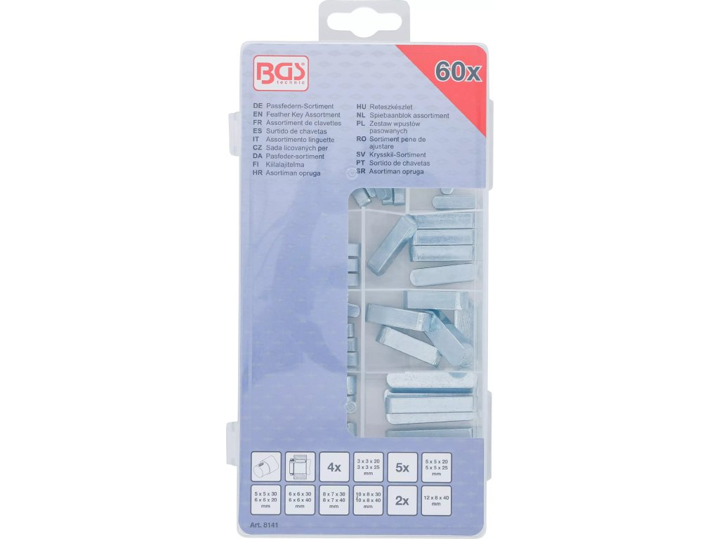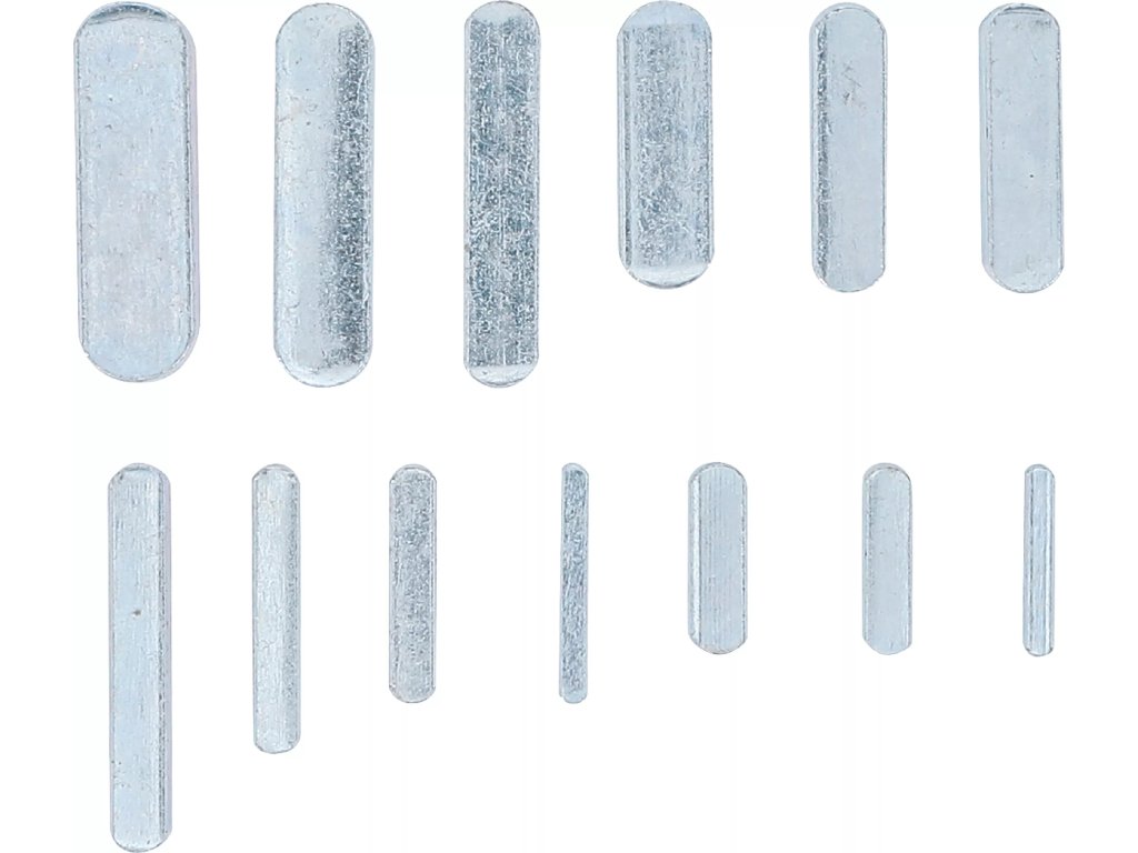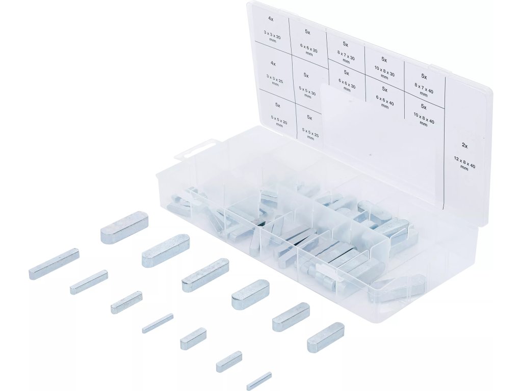 Těsná pera pro připojení nábojů na hřídele, sada 60 kusů, velikosti od 3×3×20 mm do 12×8×40 mm. Uloženo v praktickém plastovém pouzdře.