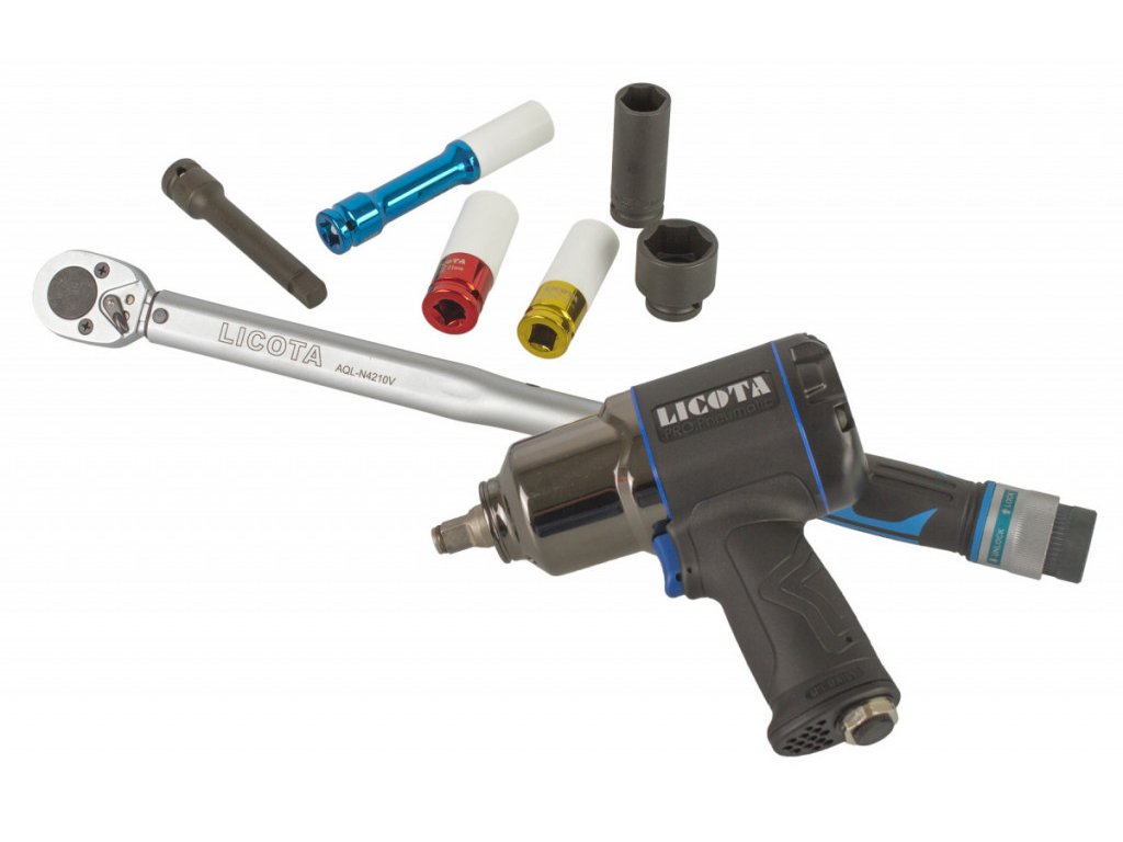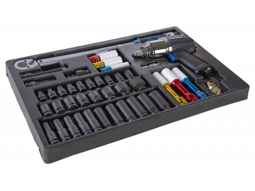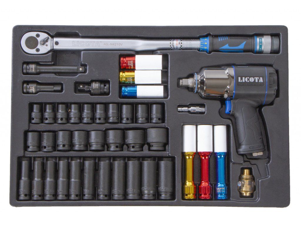 Výplň pojízdného vozíku s pneumatickým utahovákem, momentovým klíčem a nástrčnými klíči od značky LICOTA.