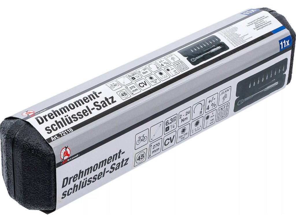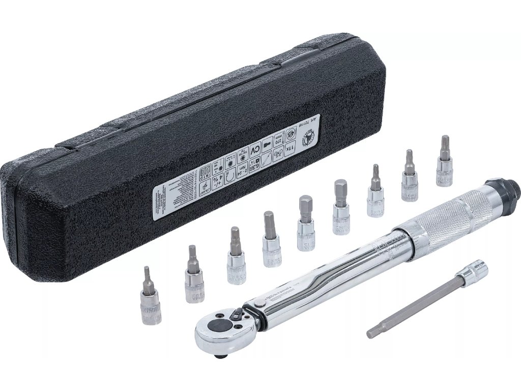 Kompaktní 11dílná sada momentového klíče 1/4" je určena pro přesné montážní práce na jízdních a horských kolech.
