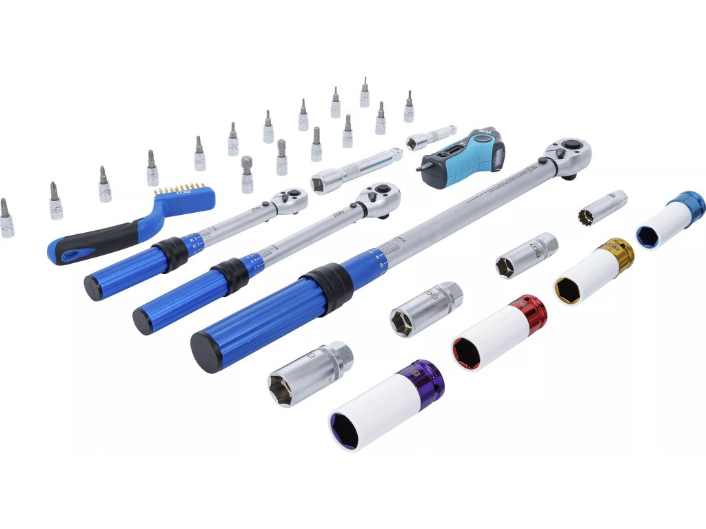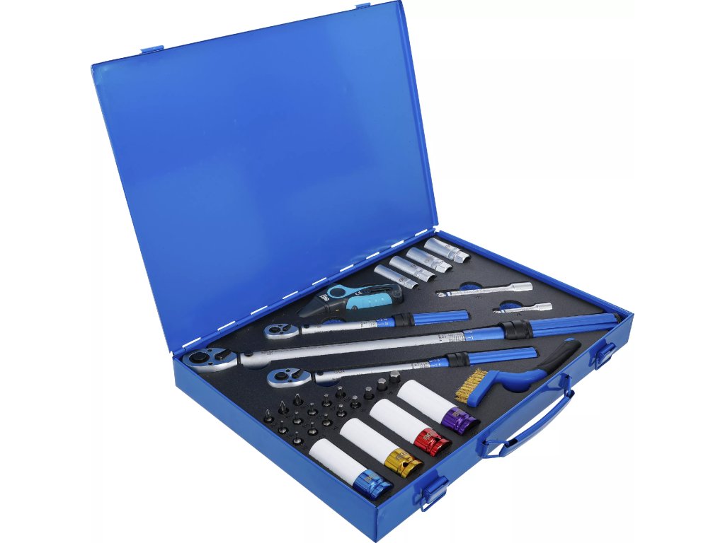Sada je vhodná pro běžné servisní práce, údržbu strojů, výměnu kol na vozidlech i montážní činnosti vyžadující přesné dotažení šroubů. Barevně odlišené nástrčné hlavice jsou použitelné i s rázovými utahováky.