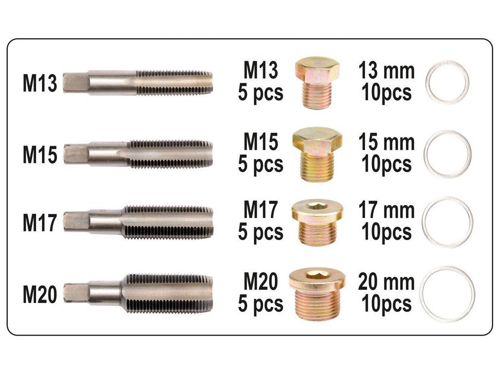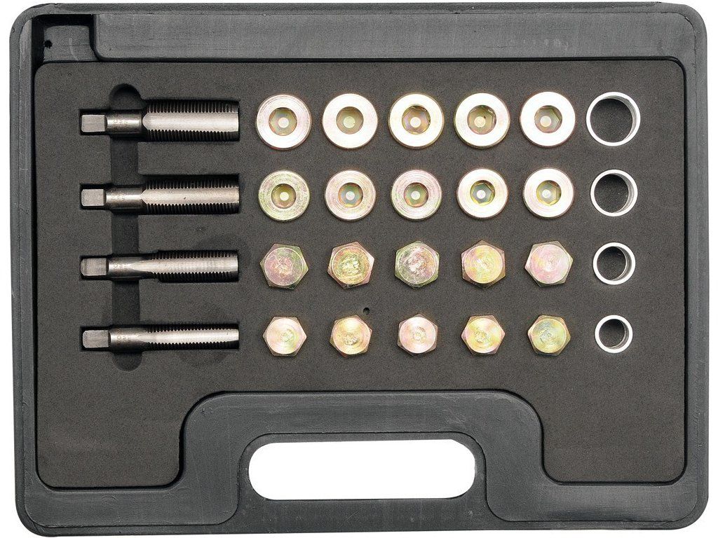 64 dílná sada na opravu závitů vypouštěcích šroubů olejových van.