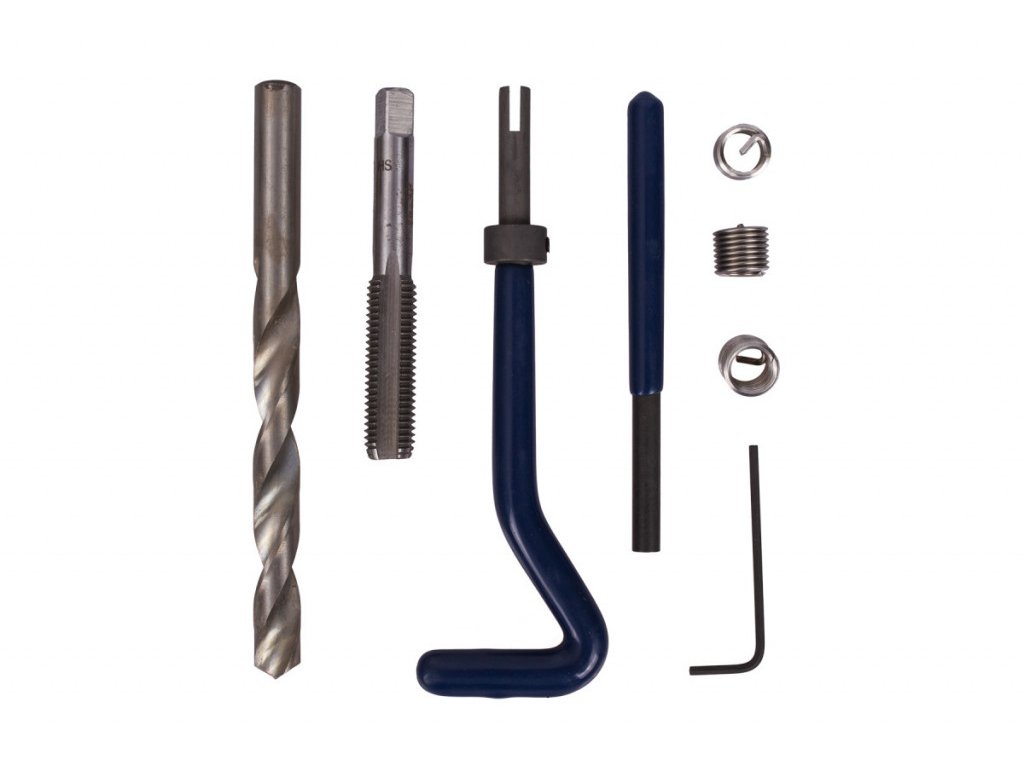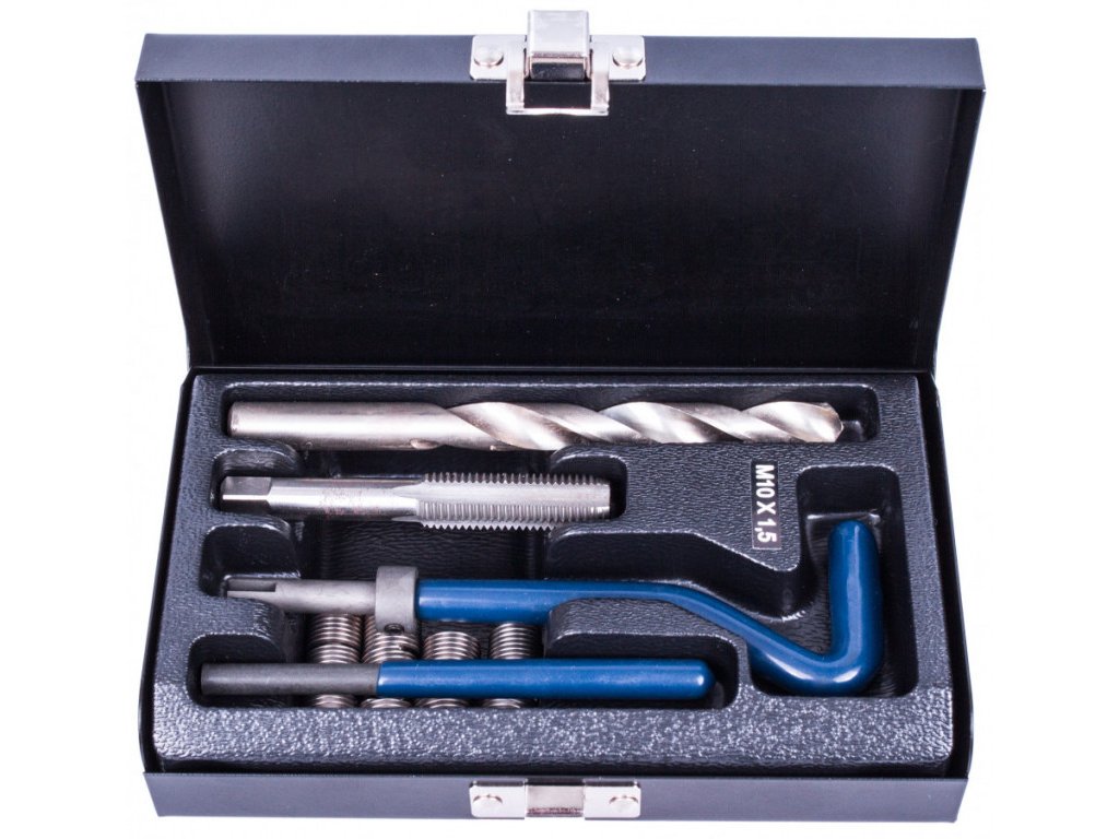 Sada na opravu závitů ve variantě M10, 15 kusů, obsahuje vrták HSS, šroubový čep, rozrážecí a instalační přípravek, imbusový klíč a 10 vložek závitu, dodáváno v plechové krabičce.