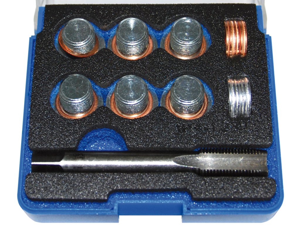 Kompletní sada na opravu poškozených závitů výpustných šroubů olejových van.