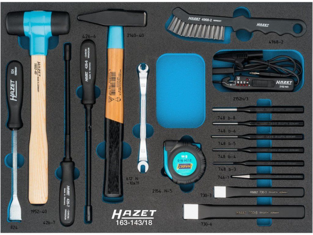 Sada nářadí kvalitní německé značky Hazet ve vložkách z měkké pěny Safety Insert System, což je pěnová vložka, v které je veškeré nářadí bezpečně ukotveno. Veškeré nářadí je omyvatelné pod tekoucí vodou.