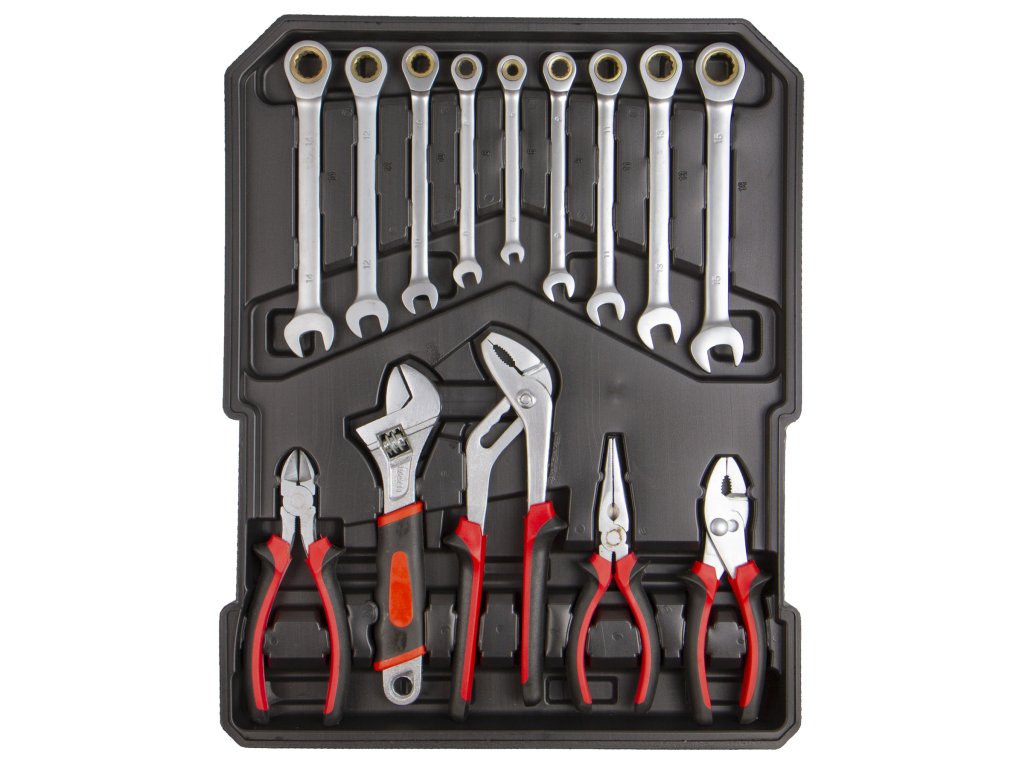 Nářadí je uloženo ve 4 plastových platech. To zaručuje perfektní přehled a usnadňuje orientaci.