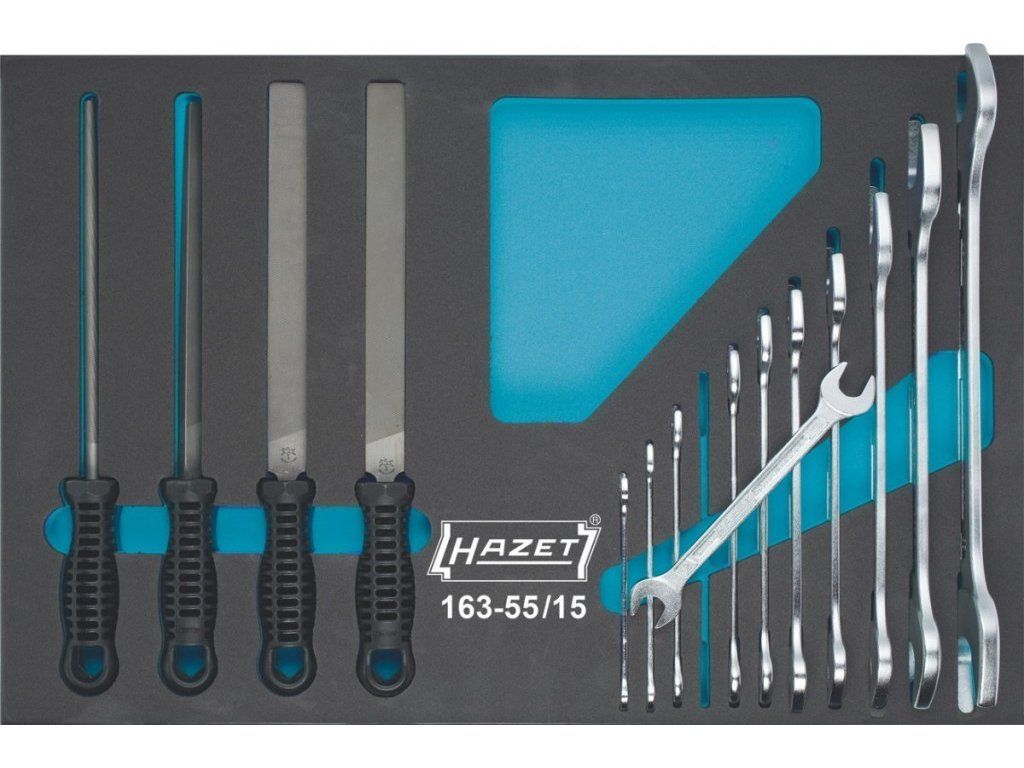 Sada oboustranných plochých klíčů a pilníků, německá kvalita HAZET, celkem 15 kusů v pěnové výplni vhodné do montážních vozíků.