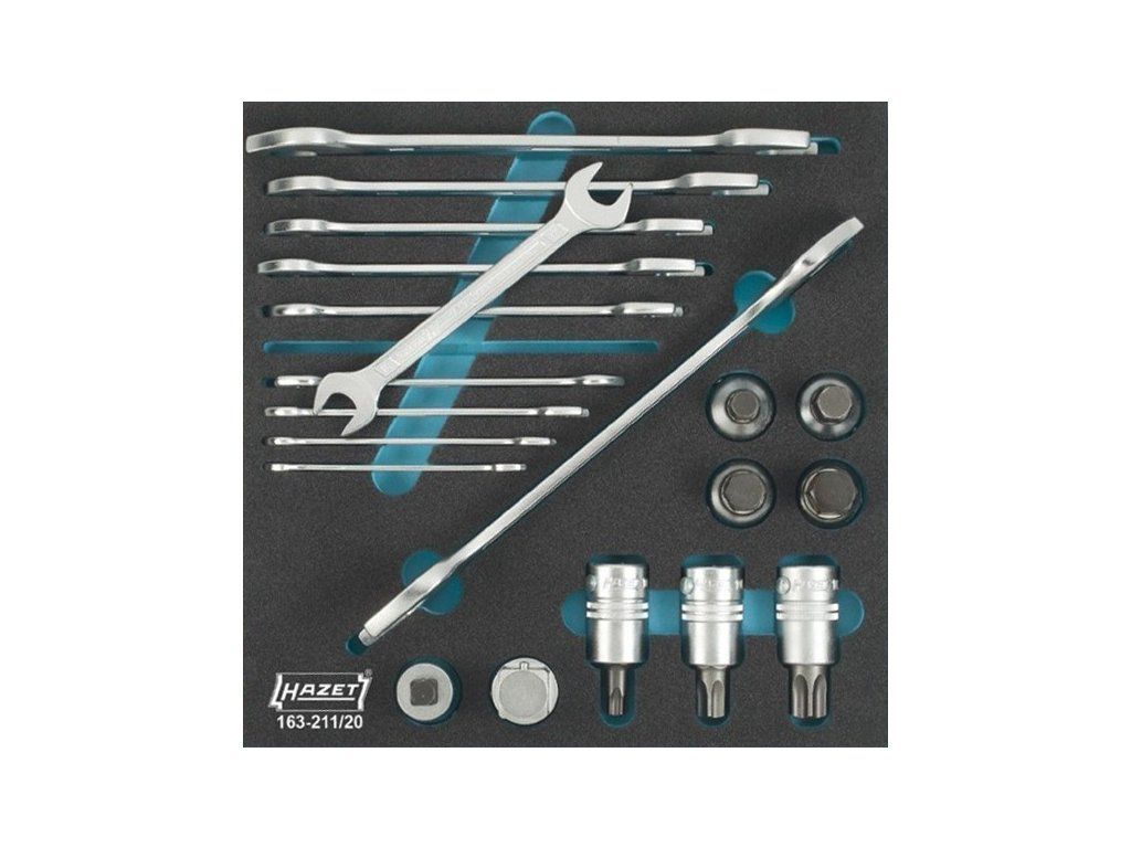 Kvalitní sada nářadí od výrobce HAZET v pěnové vložce, ideální do pojízdných vozíků, obsahuje ploché klíče, hlavice s bitem TORX T60-100, s bitem IMBUS 14-22 mm.