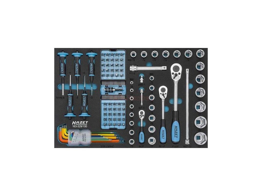 Sada kvalitního nářadí HAZET (Německo), celkem 100 kusů v pěnové vložce, vhodná pro dílenské vozíky HAZET, obsahuje gola sadu 1/4", 3/8" i 1/2", sadu bitů, imbusy a vyrážeče.