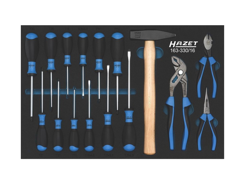 Sada nářadí od kvalitního německého výrobce HAZET, celkem 16 kusů v pěnové vložce, obsahuje kladivo, sadu šroubováků a 3 kleště.