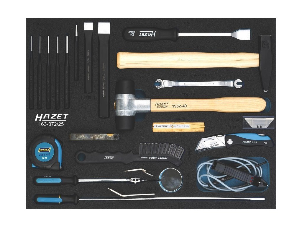 Sada nářadí HAZET, německá kvalita, celkem 25 kusů v pěnové vložce, vhodná pro dílenské vozíky HAZET, obsahuje dláta, kladivo, paličku a spoustu dalšího nářadí.
