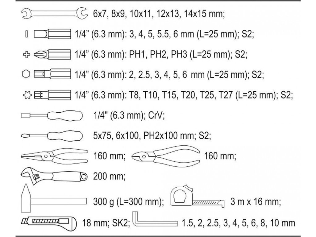 Obsahuje celou řadu nástrojů vhodných jak pro údržbáře, tak i pro běžnou dílnu či domácnost, nebo kamkoliv na cesty.