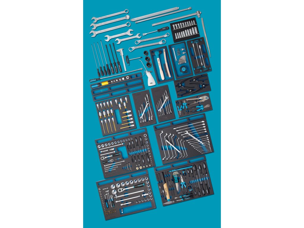 Základní vybavení pro pracoviště oprav vozů Mercedes-Benz, německá kvalita HAZET, obsahuje celkem 296 kusů nářadí, vhodné pro dílenské vozíky HAZET.