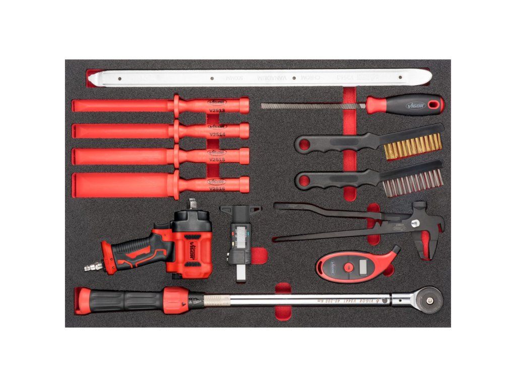 Sada nářadí na kola a pneumatiky ve výplni do dílenských vozíků, obsahuje pilník, kartáče, měřiče, aj. V pěnové vložce je obsaženo celkem 13 ks nářadí, je odolná vůči olejům a snadno omyvatelná. Rozměr: 563 x 393 x 35 mm.