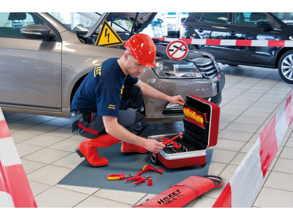 Sada nářadí pro hybridní vozidla a elektromobily v pojízdném kufříku HAZET. Sada nářadí a s Gola sadou 3/8".