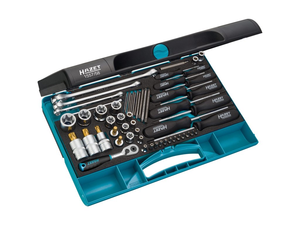 Kvalitní sada nástrčných klíčů HAZET (Německo), 58 kusů v plastovém kufříku, obsahuje 1/4", 3/8" i 1/2" TORX klíče, šroubováky a nástrčné klíče, ráčnu a další.