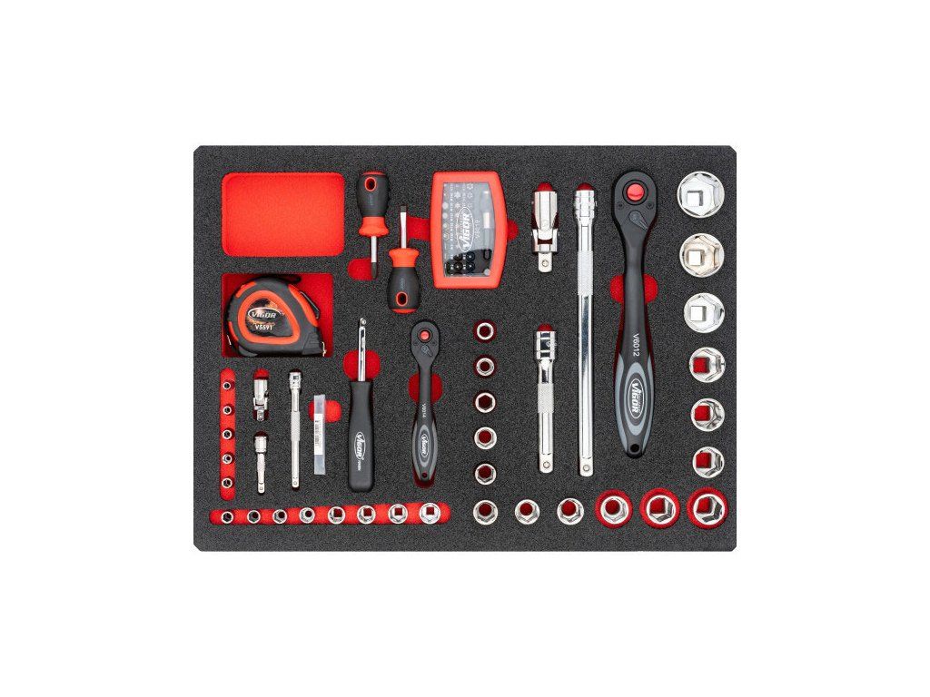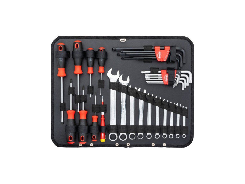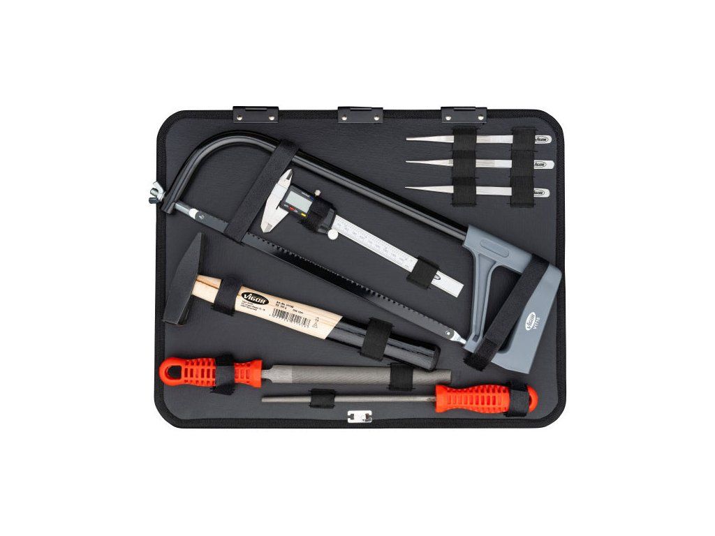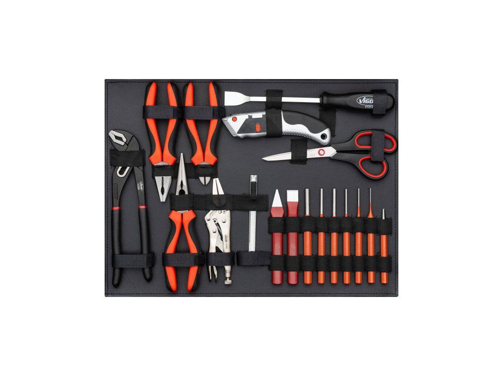 Nářadí je uloženo v pěnových vložkách nebo připevněn popruhy, zůstává tedy přehledně uloženo i při přenášení.