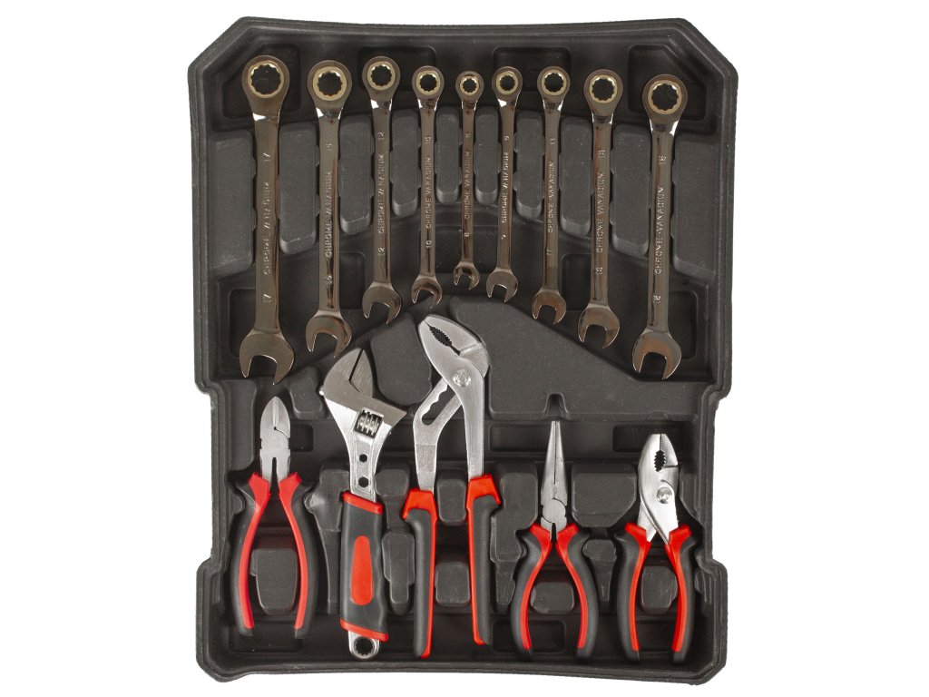 Kompaktní sada ručního nářadí se skládá ze 187 dílů včetně samotného hliníkového kufru. Nářadí je vyrobeno ze slitiny Cr-V a je prakticky uložené ve 4 plastových platech, které můžete vyjmout a v případě potřeby přenést na místo montáže pouze potřebné nářadí. Toto uložení zrychluje orientaci v nářadí, šetří Váš čas, usnadňuje práci a zaručuje perfektní přehled o chybějícím nářadí.