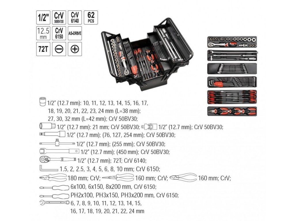 Kovový box s nářadím YATO, 62 kusů z chrom-vanadia, obsahuje nástrčné klíče a ráčnu, adaptéry, klíče, kleště, šroubováky a mnoho dalšího.