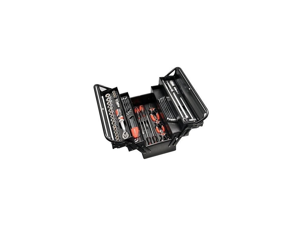 Sada základního nářadí v kovovém rozkládacím kufru vhodná pro údržbáře, nebo jako výbava do nákladního automobilu a podobných mechanizačních zařízení.