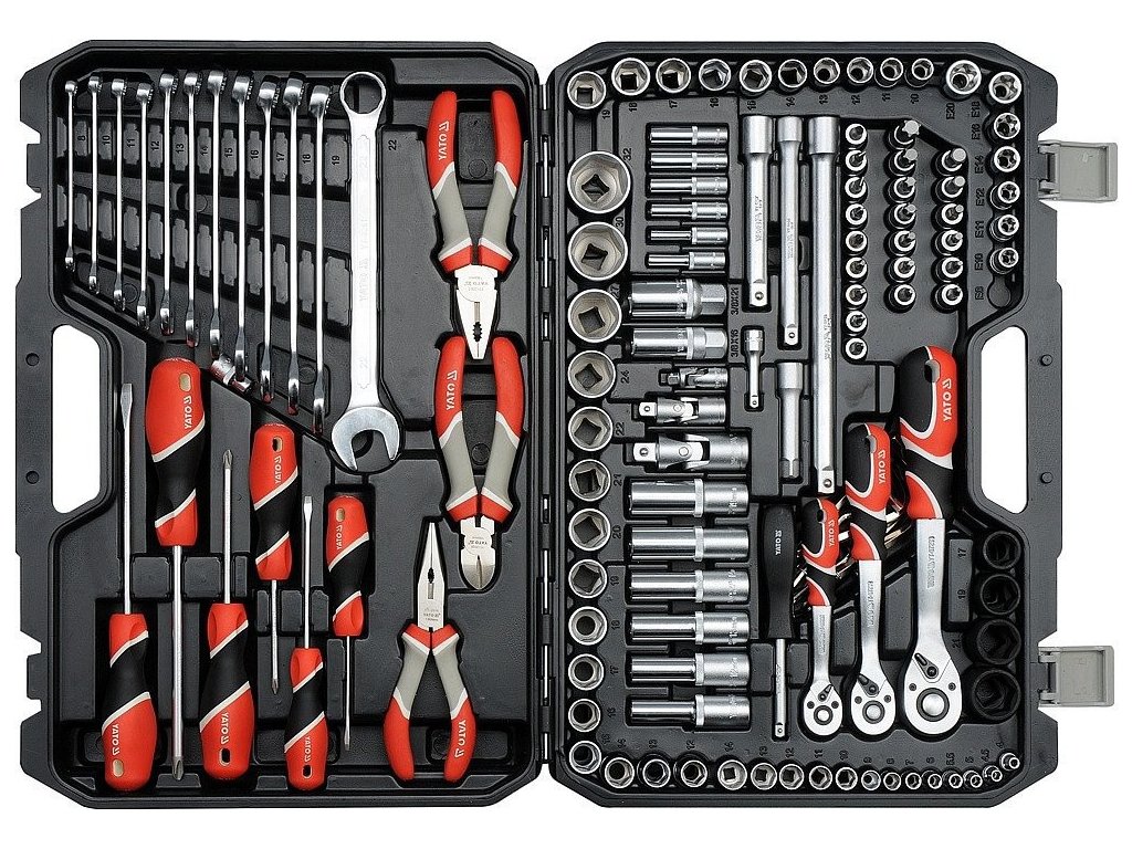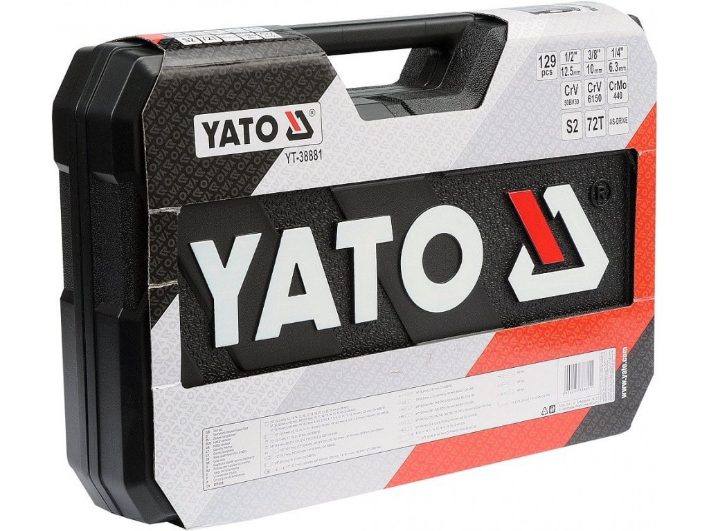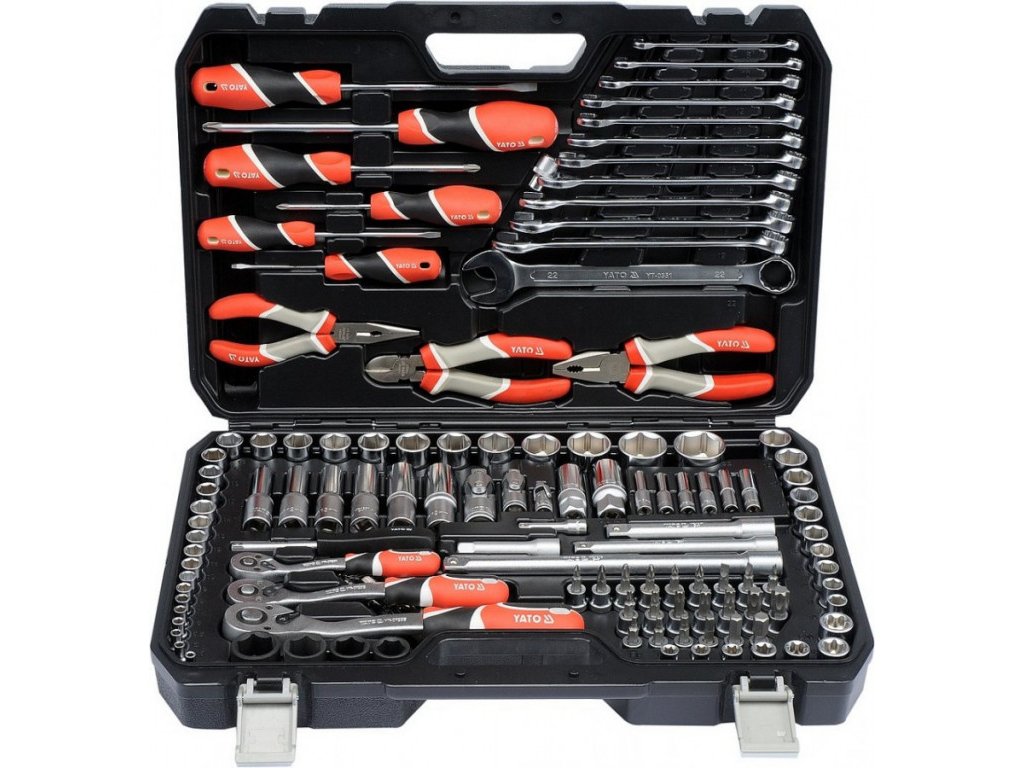 Profesionální gola sada YATO, 129 kusů nářadí 1/2", 3/8" i 1/4", obsahuje mj. ořechy, ráčny, nástavce na svíčky, kloubové a prodlužovací adaptéry, bity kleště a šroubováky.