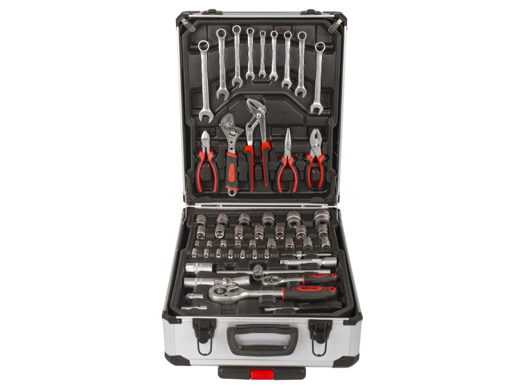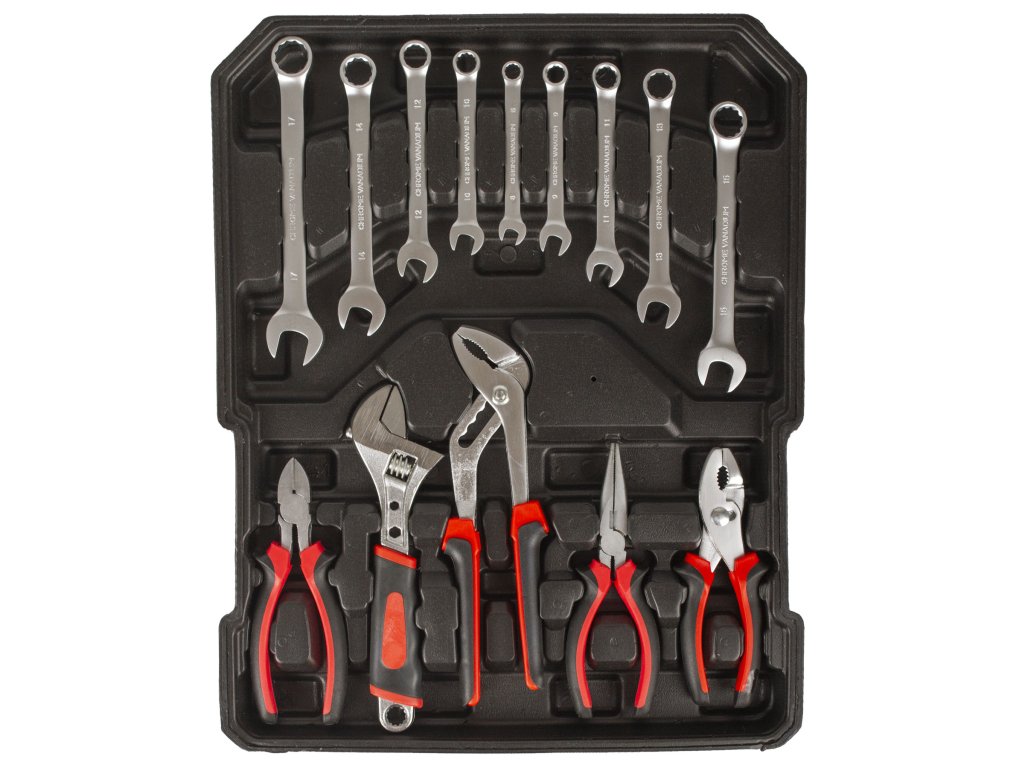 - Sada obsahuje: celou řadu kleští, šroubováků, gola klíčů, kladivo, vodováhu, stranové i imbus klíče, bity, základní spojovací materiál a další nářadí, které je vhodné pro použití jak doma, v garáži, tak i na cestách.
