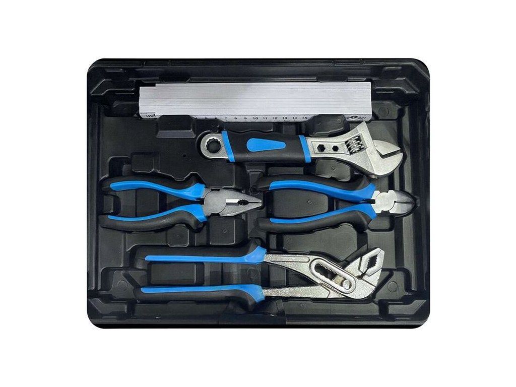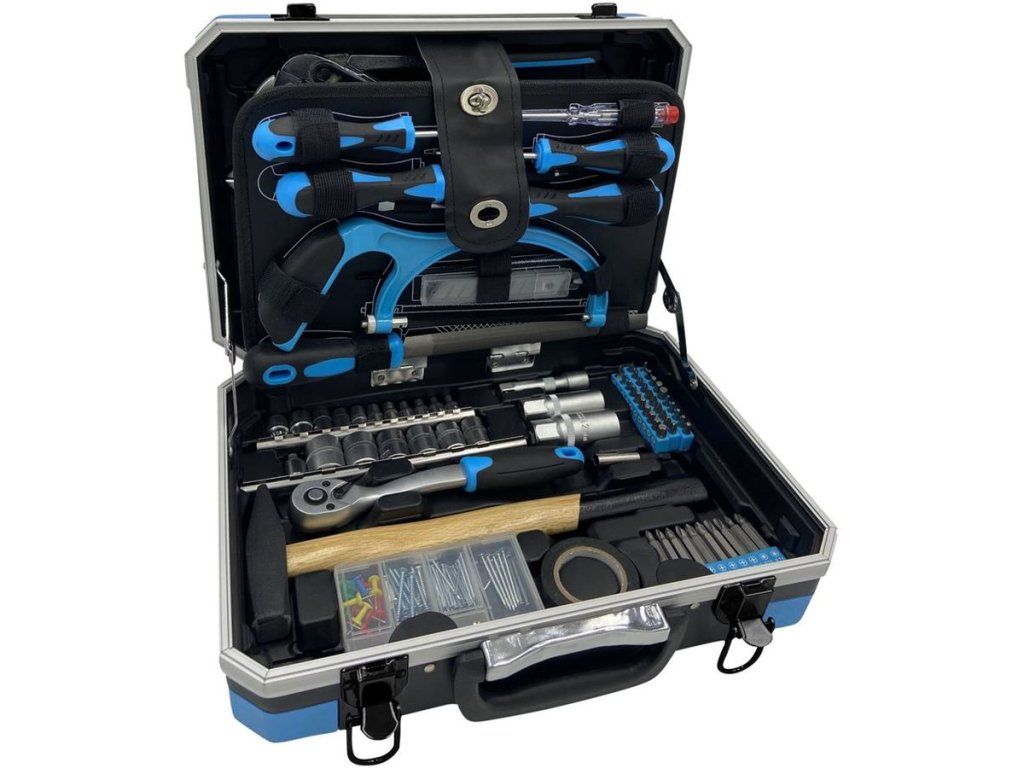 241dílná souprava z chrom-vanadové (uhlíkové) oceli, sestávající z nejrůznějších druhů nářadí: od šroubováků přes ráčnu, rozličné nástrčné i očko-ploché klíče, kleště ap. až po pilu a široký výběr bitů (vč. dlouhých). Chybět nemůže ani vodováha, metr a kladivo. Kufřík dále obsahuje krabičku s roztříděným spojovacím materiálem - hřebíky a šrouby. Tento všestranný pomocník je opravdu dobrou volbou, ať už si jej pořídíte pro práce ve vlastním bytě nebo jako výbavu pro osamostatňující se potomky.