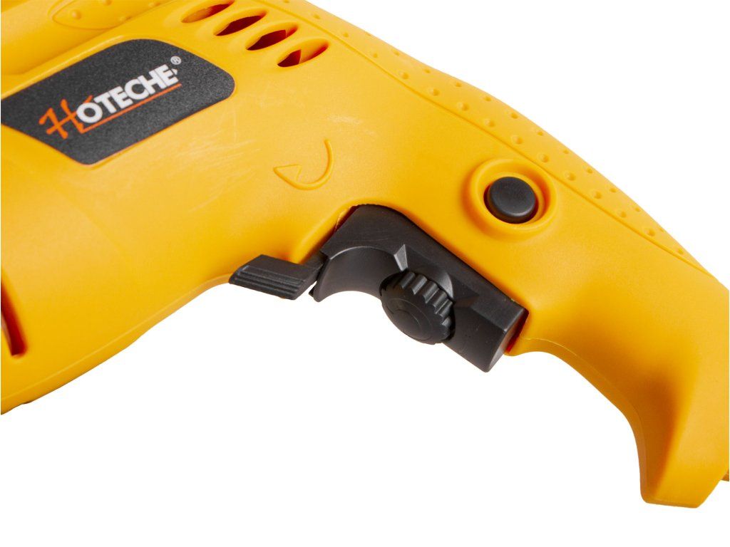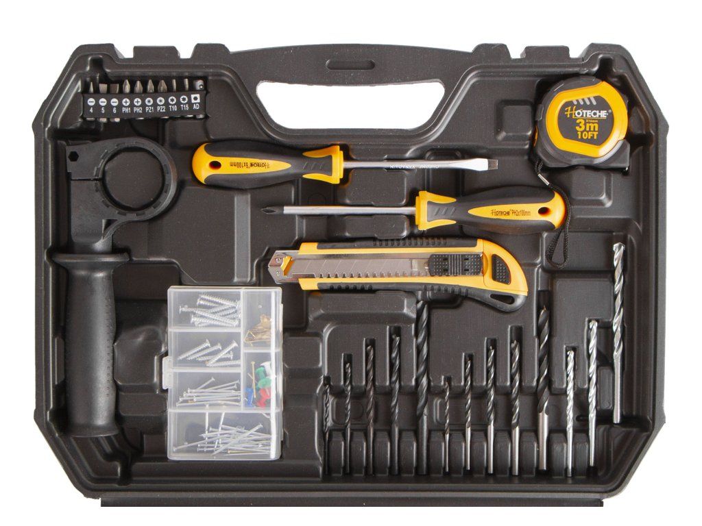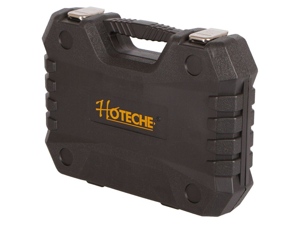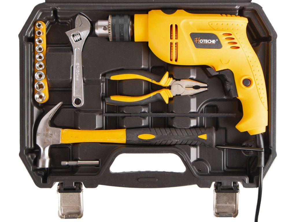 Sada nářadí s elektrickou příklepovou vrtačkou od značky Hoteche v plastovém kufříku.