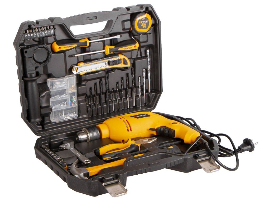 Sada nářadí s elektrickou příklepovou vrtačkou 600 W, 101 ks. Sada bitů, kombinované kleště, šroubováky, sada vrtáků, svinovací metr a další.