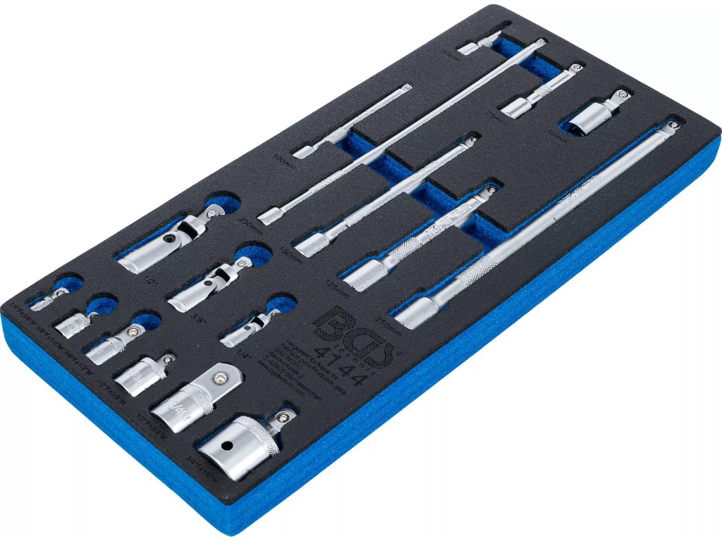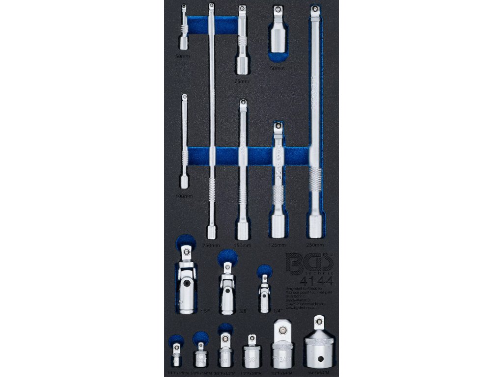 Pěnová vložka do dílenského vozíku, sada nástavců, adaptérů a kloubů, 17dílná. Chrom-vanadová ocel. Chromovaný, matný povrch. Rozměr výplně 408 x 189 x 32 mm.