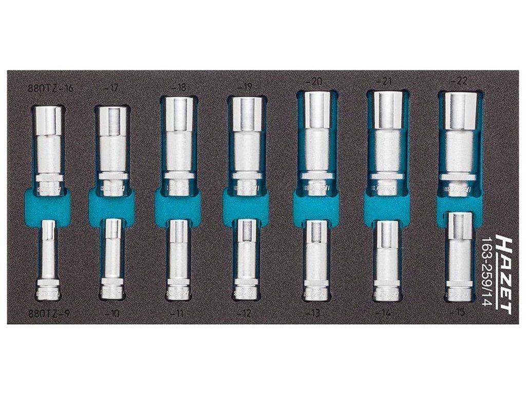 Sada kvalitních nástrčných hlavic s dvojitým šestihranem HAZET, 14 kusů v pěnové vložce, vnitřní čtyřhran 3/8", velikost 9 až 22 mm.