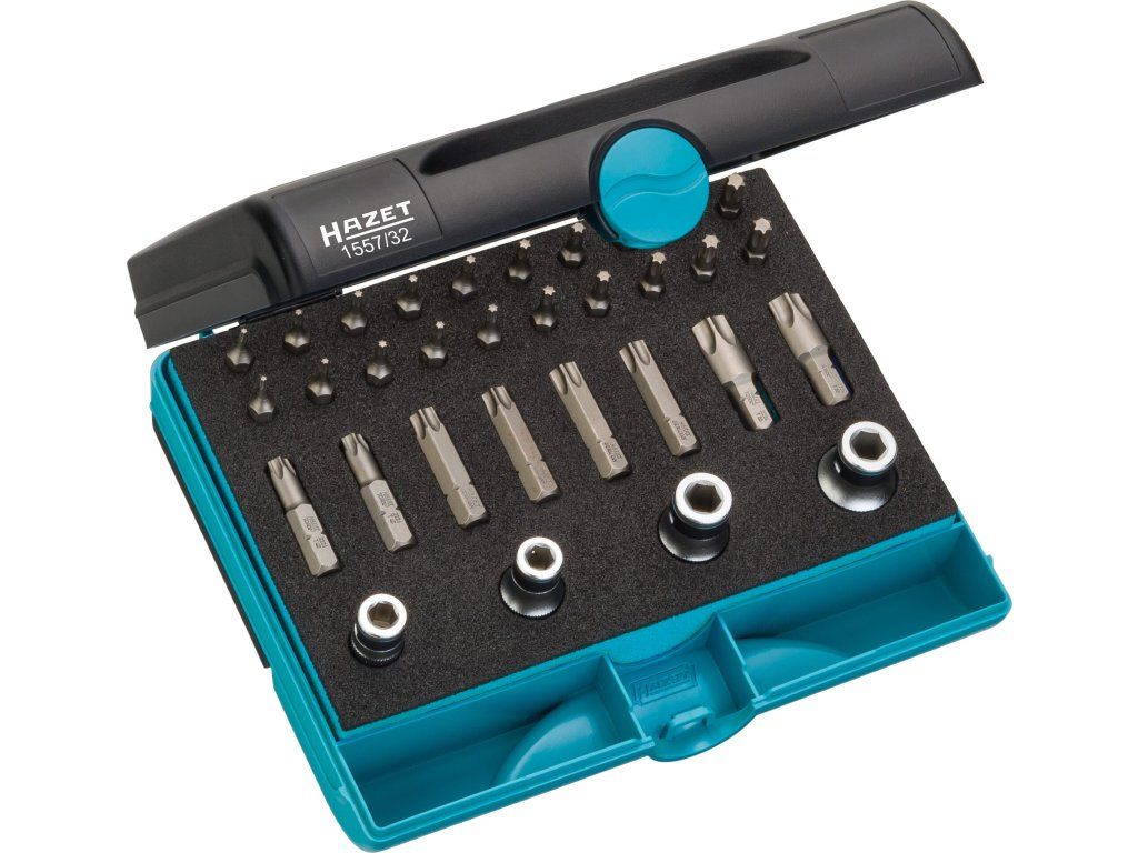 Sada TORX bitů od německého kvalitního výrobce HAZET, 32 kusů v plastovém kufříku, obsahuje 2 kompletní sady bitů a redukce na běžné rozměry nářadí.
