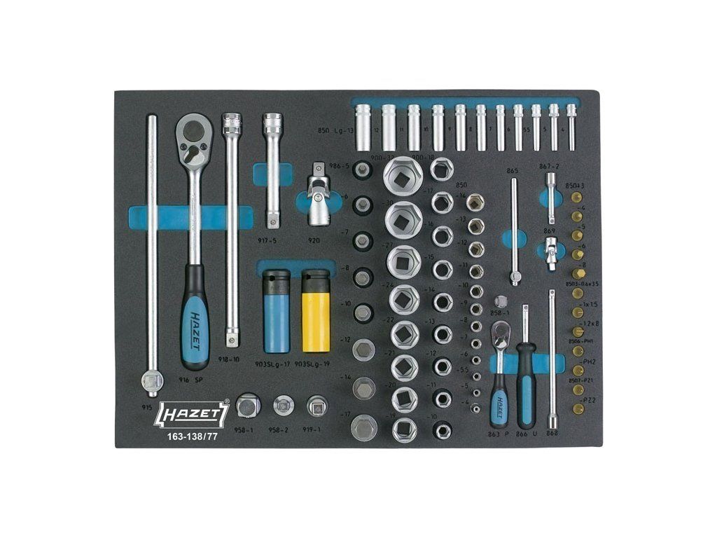 Kvalitní sada nástrčných klíčů od německého výrobce HAZET, 77 dílů, v pěnové vložce do dílenských vozíků, obsahuje gola sady 1/4" a 1/2".