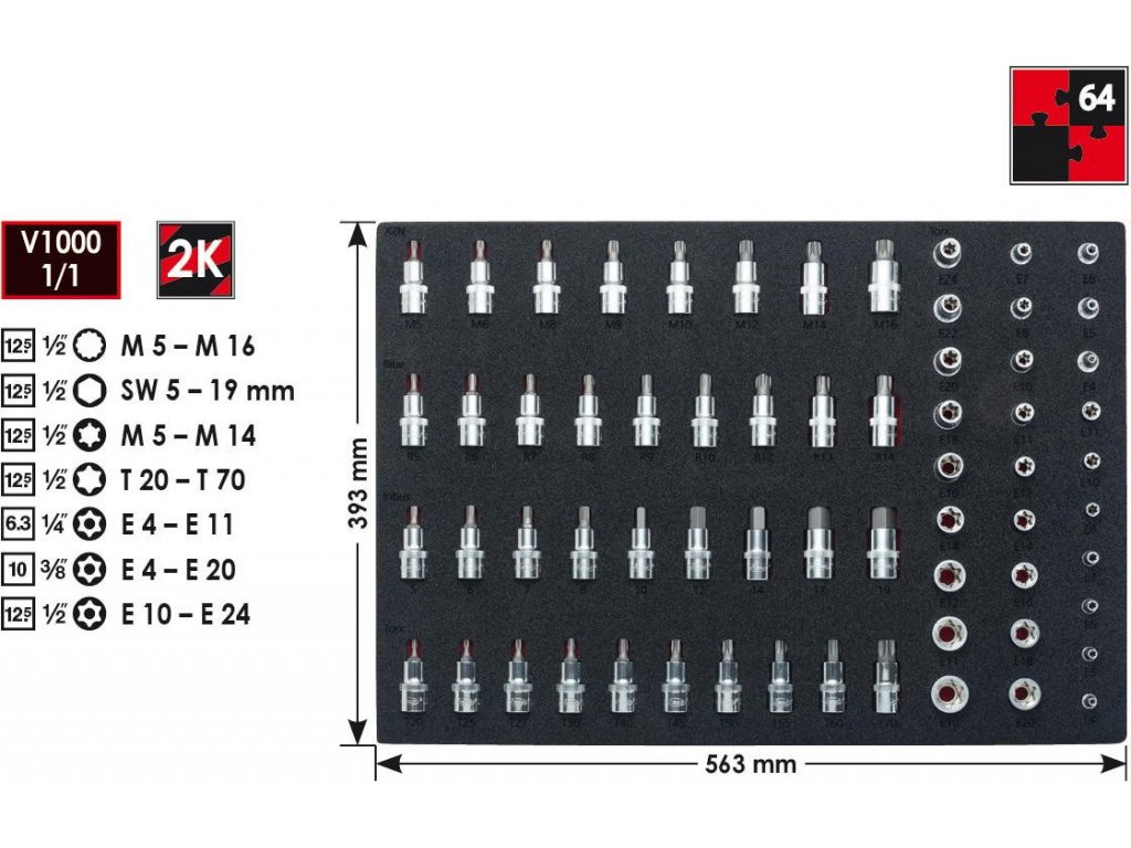 Sortiment nástrčných klíčů TORX 1/2", 1/4" a 3/8". Dále sada hlavice s bity 1/2" RIBE, TORX, HEX a XZN. Ve výplni do dílenských vozíků. 64 ks.