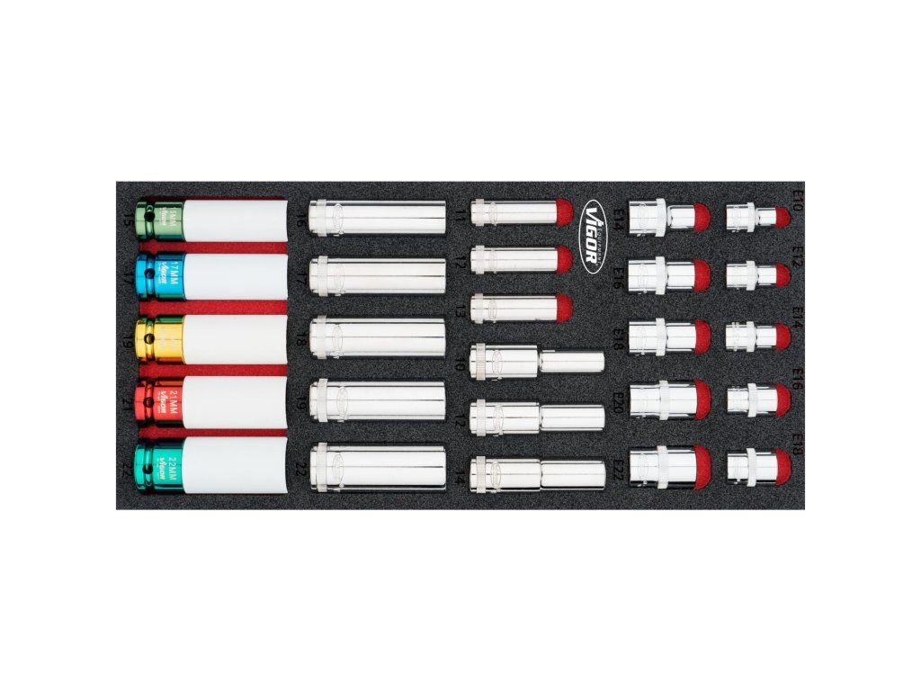 - Nástrčné klíče E-Torx 3/8": E10, E12, E14, E16, E18.