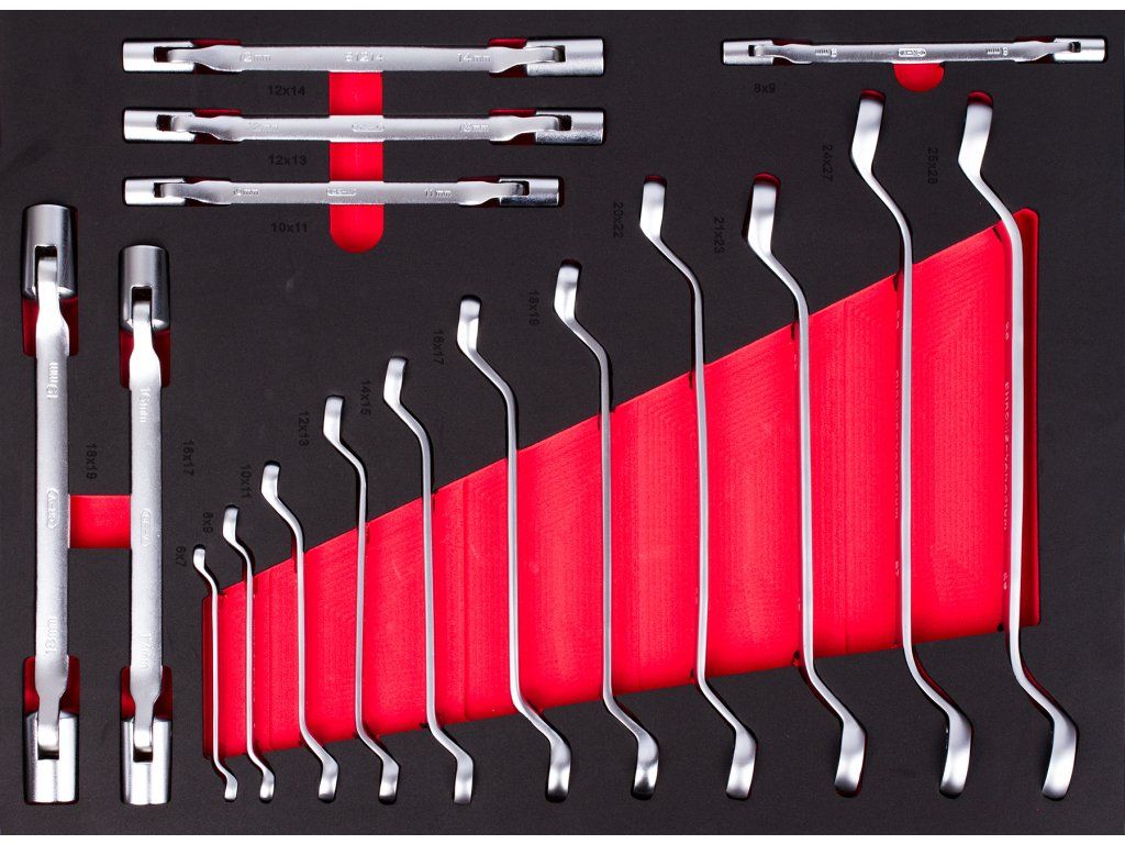 Sada oboustranných klíčů, 17 ks v pěnové výplni do dílenského vozíku, rozměry 530 x 390 mm.