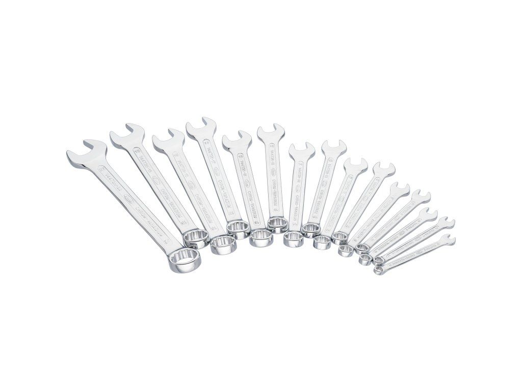 Sada 15 ks očkoplochých klíčů, zalomení 15°. Velikosti 6 - 22 mm.
