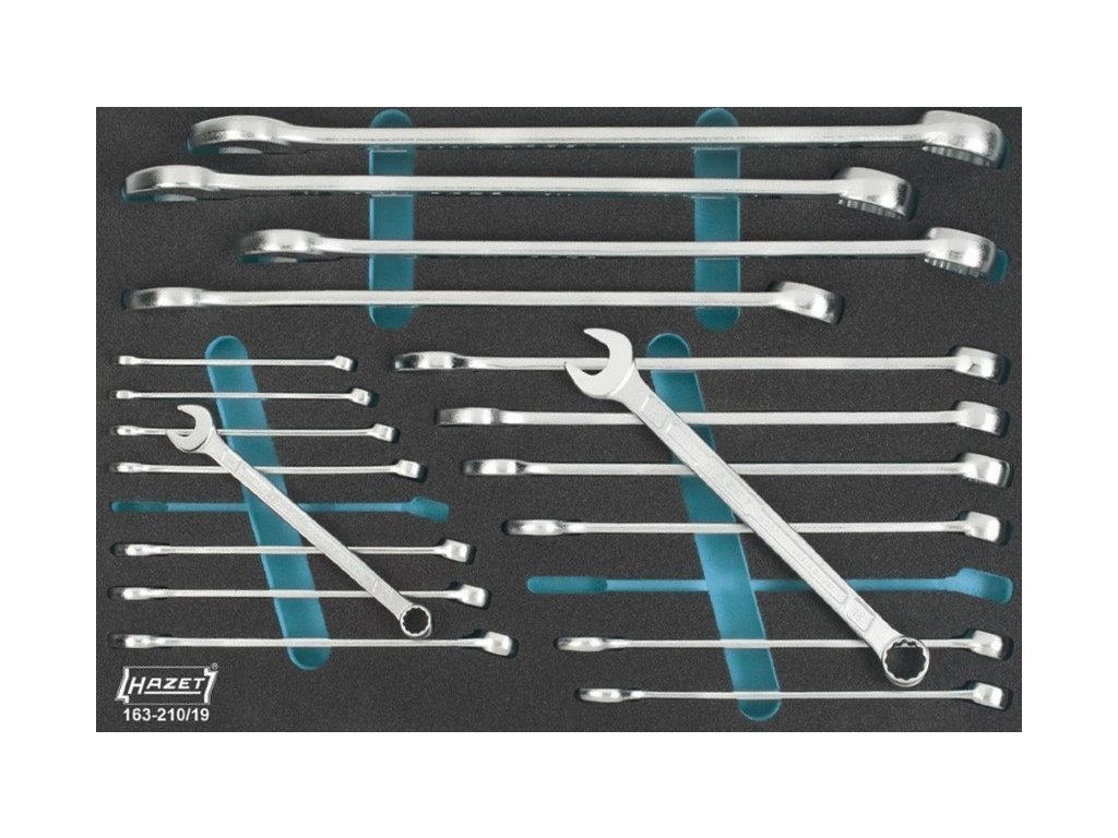 Kvalitní sada očkoplochých klíčů, německý výrobce HAZET, 19 kusů v pěnové vložce, vhodná do zásuvek pojízdných vozíků, velikost klíčů 8 až 34 mm.
