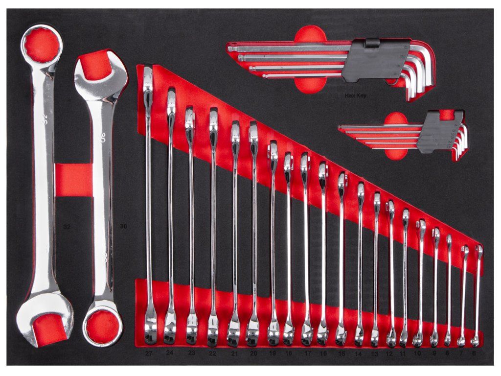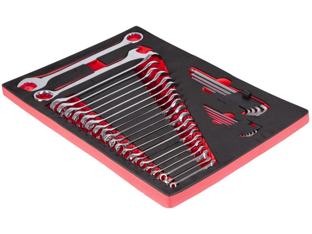 Očkoploché a imbusové klíče v pěnové výplni, sada 32 kusů. Velikost klíčů 6 - 32 mm, imbusy 1,5 - 10 mm. Vyrobeny z Cr-V oceli. Dvoubarevná pěnová vložka určena do dílenských vozíků.