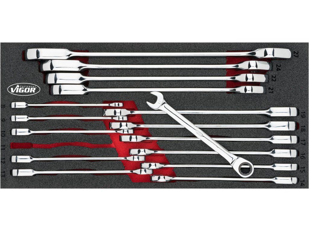 Sada očkoplochých ráčnových klíčů ve vložce do dílenských vozíků 1/3+ 2K o rozměrech 393 x 188 mm.
