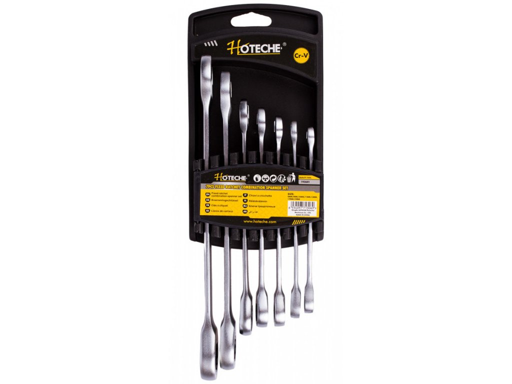 Velikost klíčů 8, 9, 10, 11, 13, 17, 19 mm, délka klíčů od 140 - 245 mm, 7 ks v sadě, Hoteche.