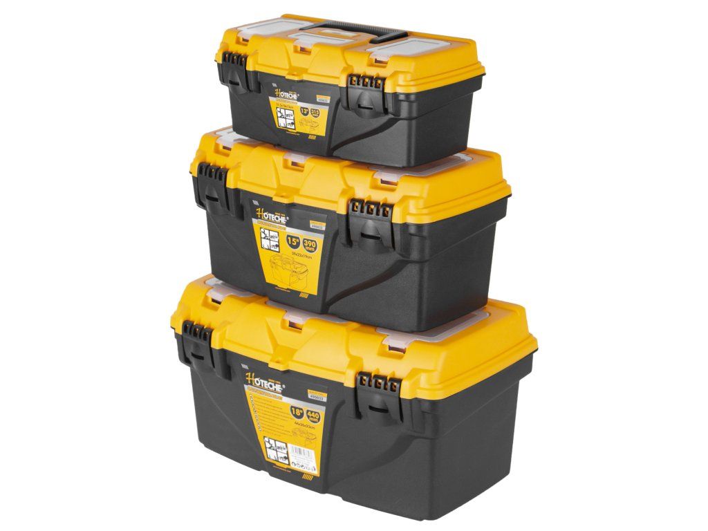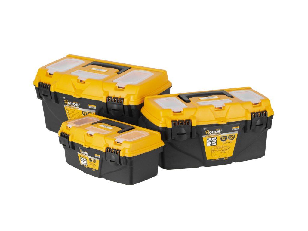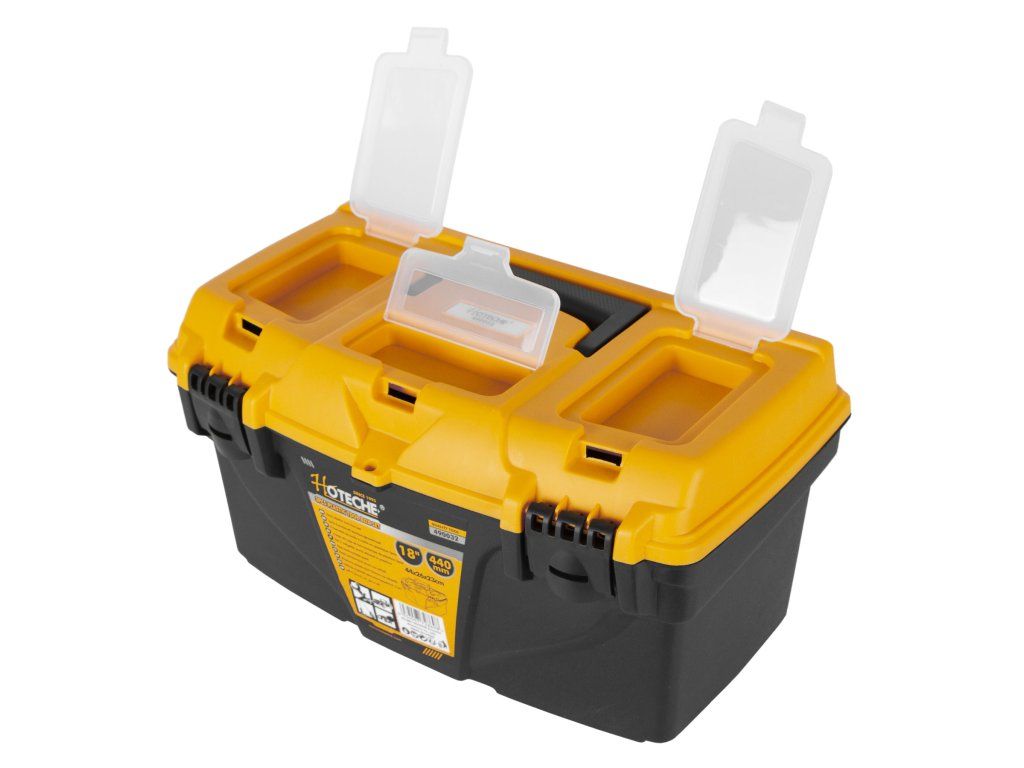 V horní části kufrů se nachází madlo pro pohodlné přenášení, ale také další úložný prostor např. pro šroubky nebo matice v podobě průhledných uzavíratelných přihrádek.