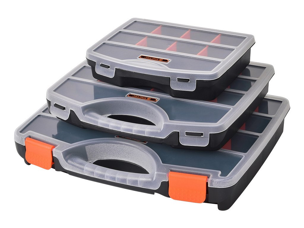 Sada 3 ks plastových organizérů, 8, 18 a 21 přihrádek. Rozměry: malý - 190 x 150 x 40, střední - 255 x 210 x 40, velký - 310 x 240 x 50 mm. Vyjímatelné přepážky.