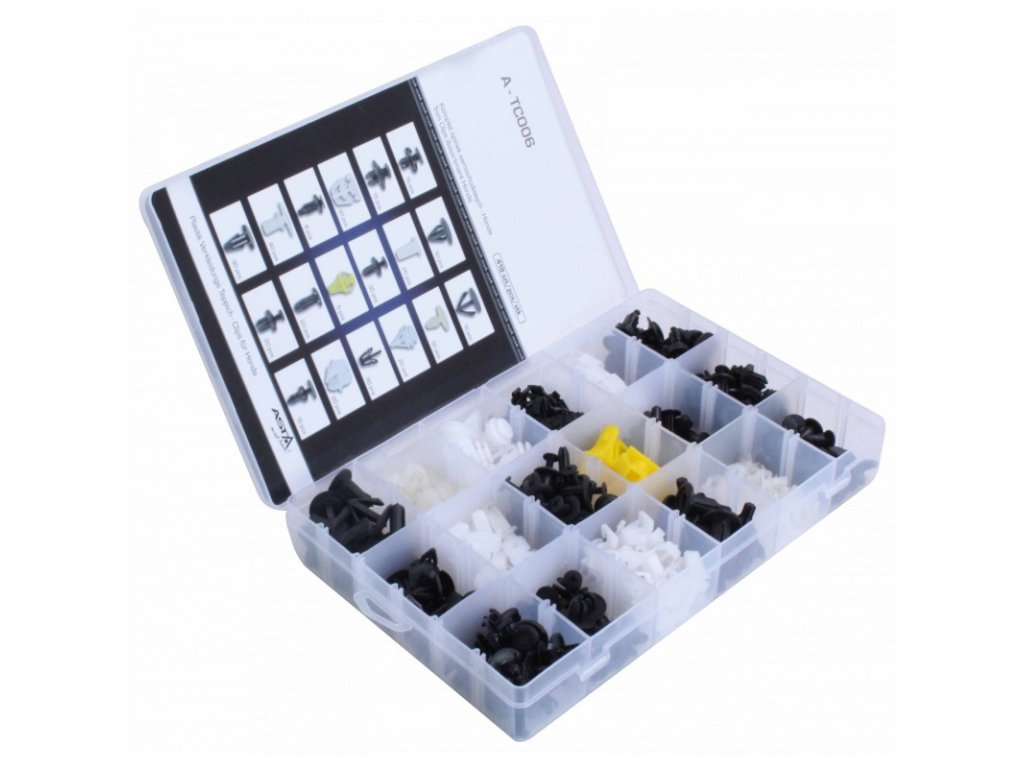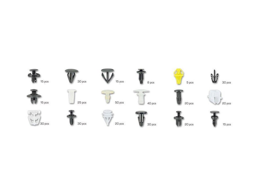 Sada nejpoužívanějších příchytek / cvočků pro čalounění a plastové díly vozů Honda. 18 různých druhů, celkem 418 ks.