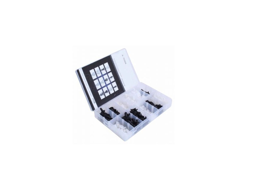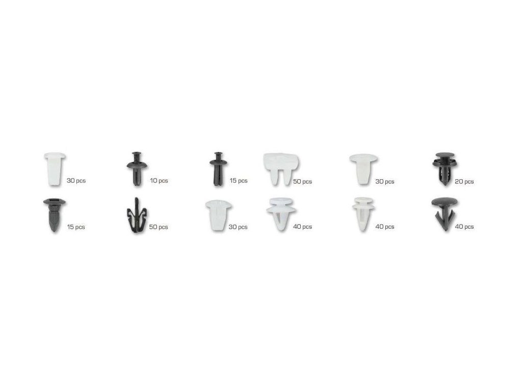 Sada nejpoužívanějších příchytek / cvočků pro čalounění a plastové díly vozů Mitsubishi. 12 různých druhů, celkem 370 ks.
